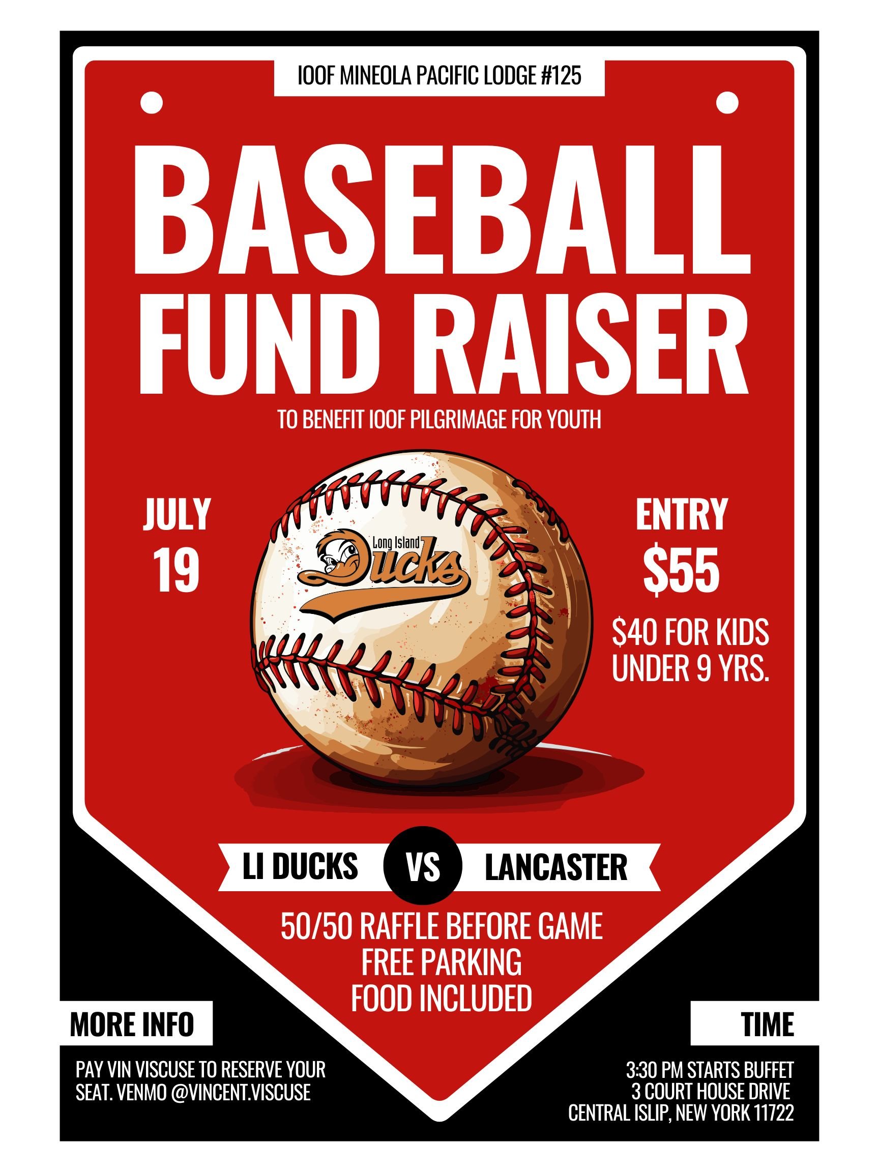 Long Island Ducks Fundraiser Sunday, July 19, 2026 3:30 PM 9:00 PM Google Calendar ICS Come join the lodge at a Ducks Game. Tickets are $55 each and includes buffet before the game. Kids under 9 years old are $40. Contact Vin Viscuse for tix.